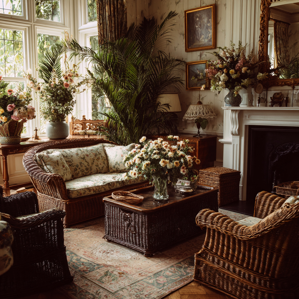Floral wallpapers, garden motifs, and fresh arrangements bring the outdoors in. Wicker and bamboo soften formal rooms with a relaxed touch that feels effortless and lived-in.