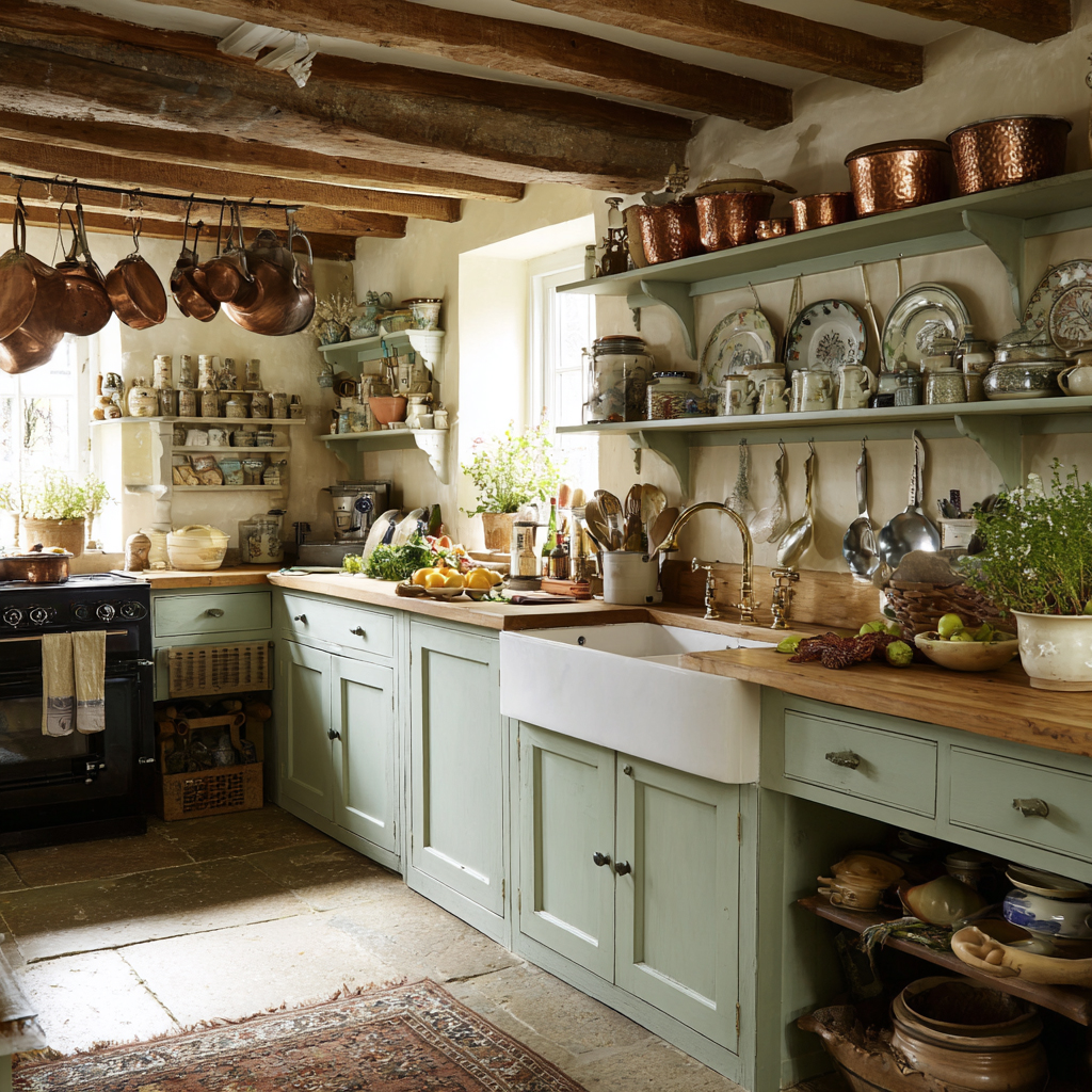The English Country kitchen is the heart of the home. Painted cabinetry in soft creams, sage greens, or muted blues sits comfortably beside butcher block, stone counters, or a worn farmhouse table that can handle anything. Open shelving displays everyday pottery, copper pans hang within reach, and a deep sink feels made for rinsing garden herbs.