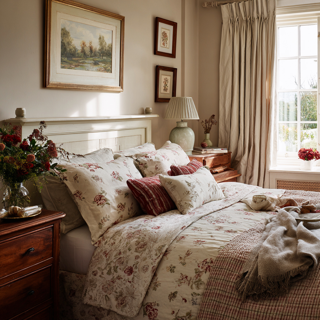 English Country bedrooms are calm, soft, and slightly nostalgic. Think painted bedsteads, quilted coverlets, crisp linens, and floral prints in gentle, faded tones. Window treatments are simple but charming — linen panels, patterned Roman shades, or small florals that echo the garden outside.