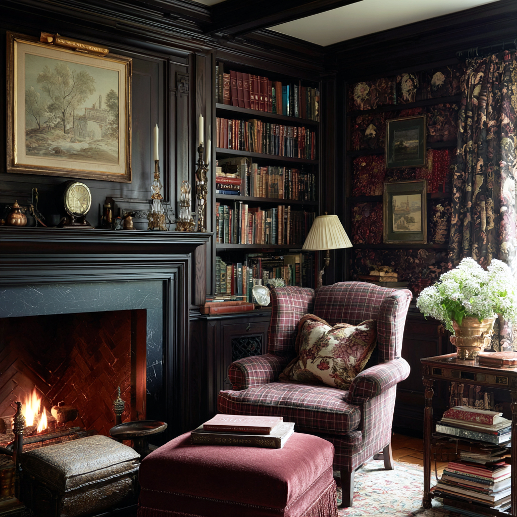 Libraries and sitting rooms carry the quiet romance of English Country life: dark wood, layered textiles, and soft lamplight glinting off brass and iron. Built-in shelves, a carved mantel, and an upholstered armchair near the fire create a space meant for reading, conversation, and rainy afternoons.