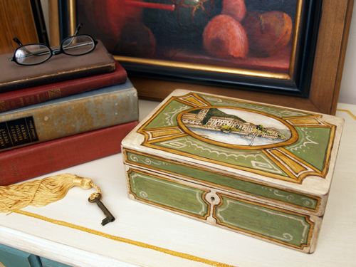Furniture varies greatly. From rustic, folk pieces to the classic veneered and hand painted items. Inlay and gilt details all support the rich visual texture of the interior environment.